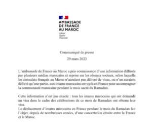 أوضحت السفارة الفرنسية في المغرب ،ما يروج بخصوص عدم منح قنصلياتها بالمملكة تأشيرات لعدد من الأئمة المغاربة المرسلين إلى فرنسا لمواكبة الجالية المغربية خلال شهر رمضان الكريم .