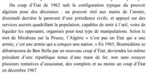 وذكر بول توليلا في كتابه إن الجزائر ليست دولة لها جيش بل جيش غزا أمة منذ انقلاب سنة 1962، على الرئيس أحمد بن بلة.